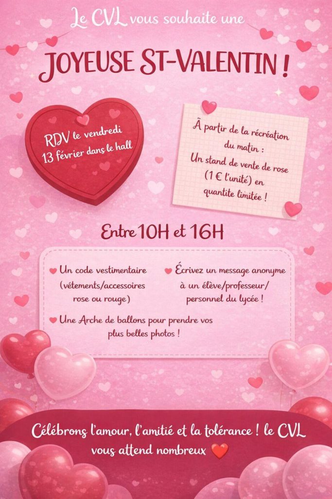 Le CVL renouvelle cette journée cette année et vous donne rendez-vous le vendredi 13 février dans le hall des élèves pour fêter l’amour, l’amitié et la bonne humeur ! 🎉